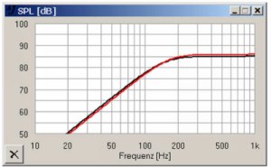 Tiefton-Simulation mit Vorwiderstand 0,2 Ohm (rot) und 0,5 Ohm (schwarz):