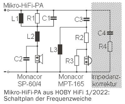 Im Schaltbild der Frequenzweiche für “Mikro-HiFi-PA” sind drei Bauteil-Nummern zu korrigieren: Statt C4 muss es C3 heißen, anstelle C5 ist C4 richtig, und L4 ist durch L3 zu ersetzen. Hier ist das korrekte